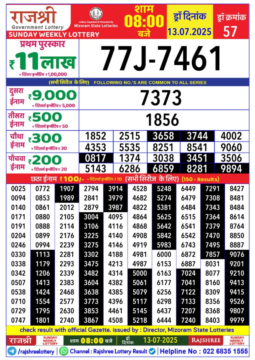 Rajshree Weekly Lottery 8PM Result 13.07.2025