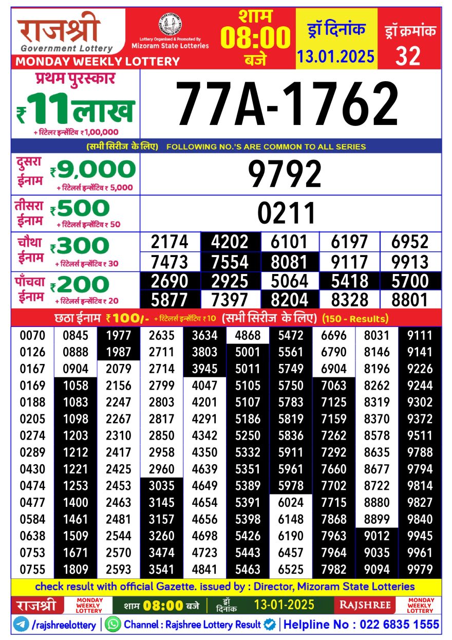 Rajshree Weekly Lottery 8PM Result 13.1.25