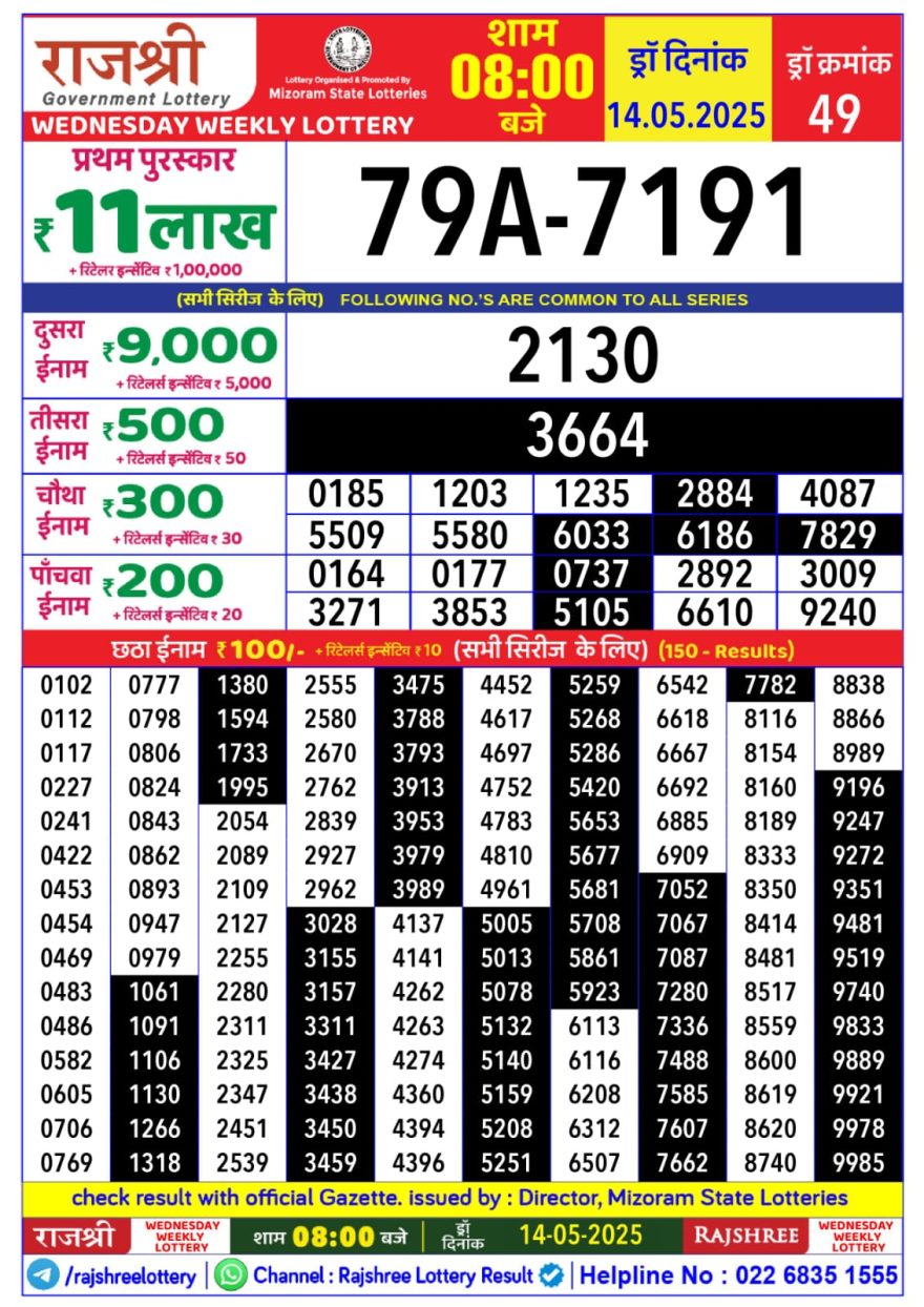 Rajshree Weekly Lottery 8PM Result 14.5.2025