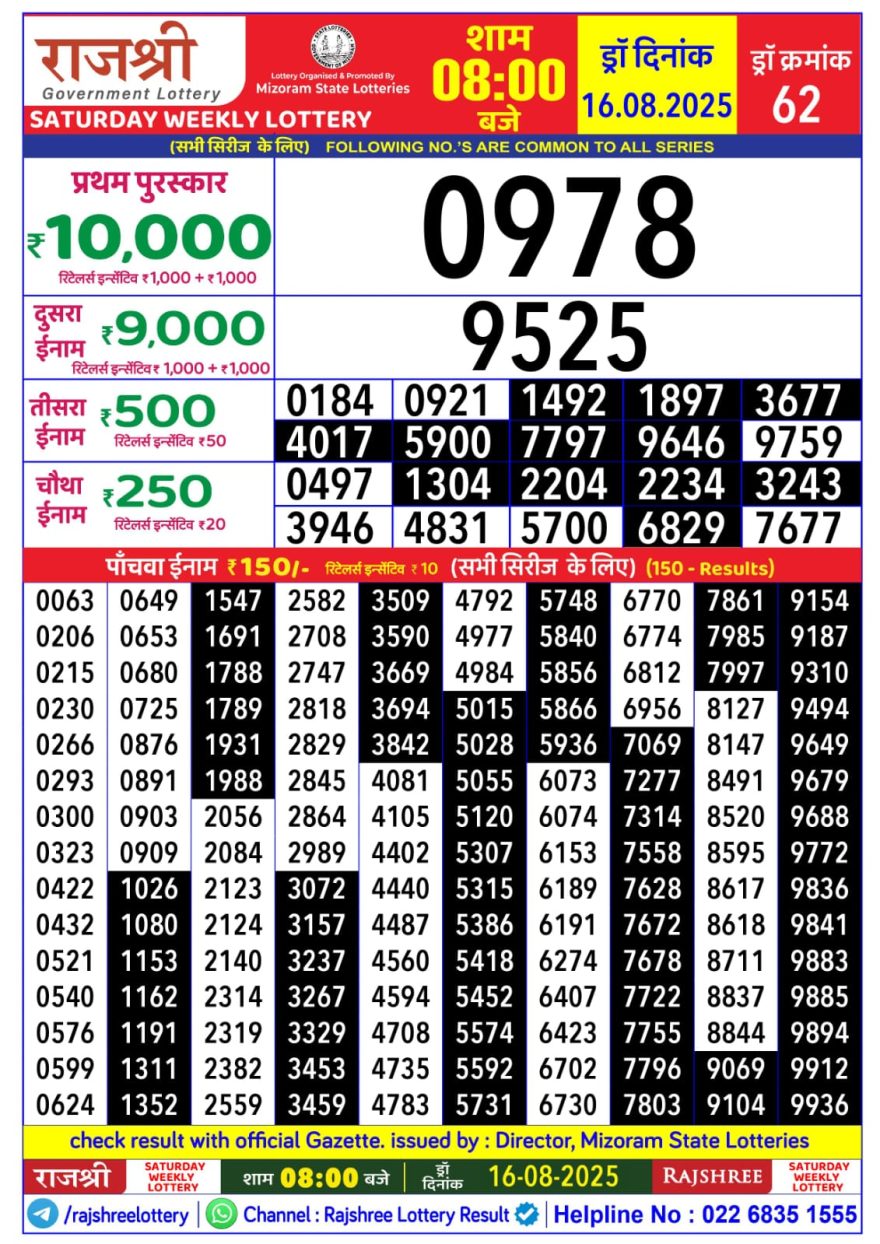 Rajshree Weekly Lottery 8pm Result 16.08.2025