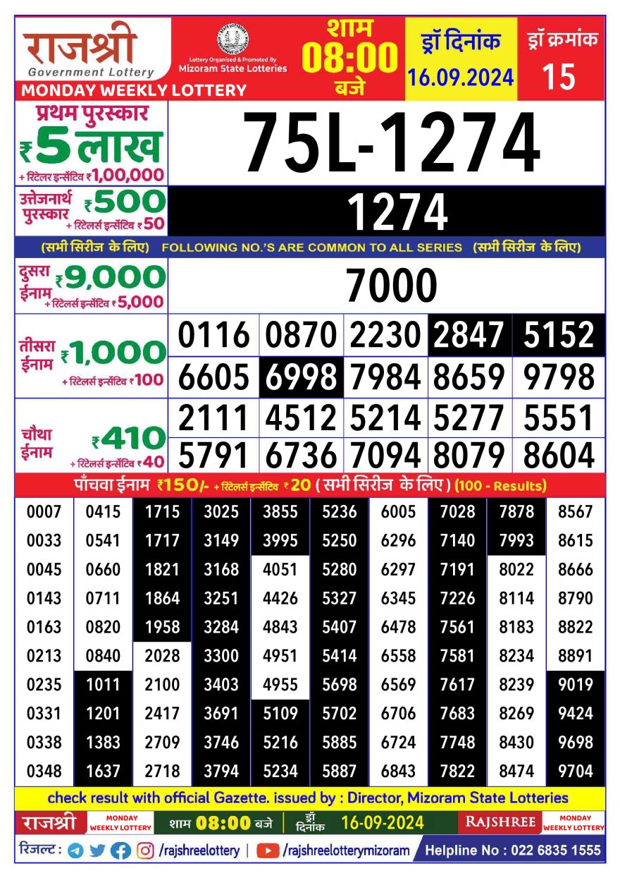 Rajshree  Weekly Lottery 8PM Result 16.09.24
