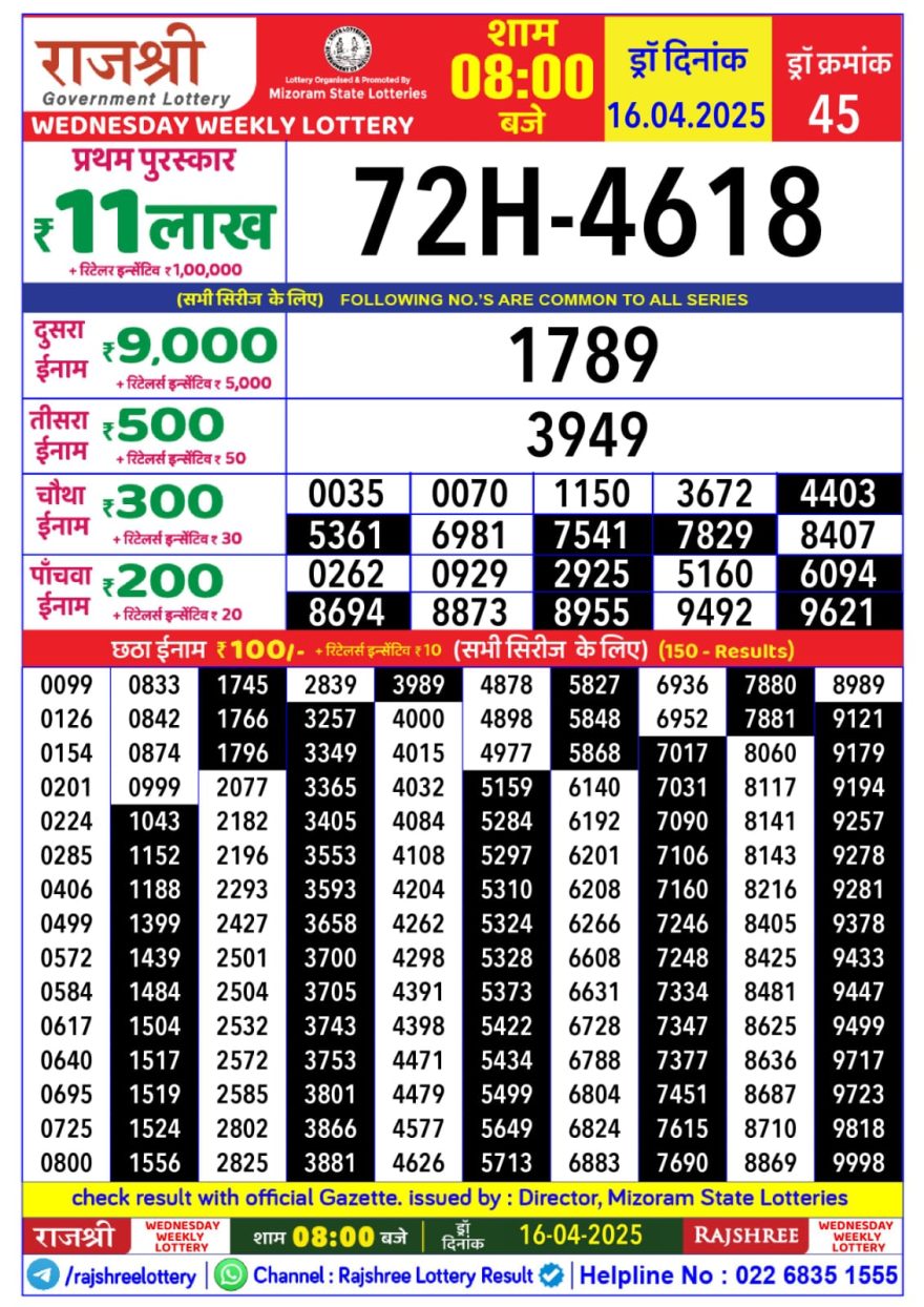 Rajshree Weekly Lottery 8PM Result 16.4.25