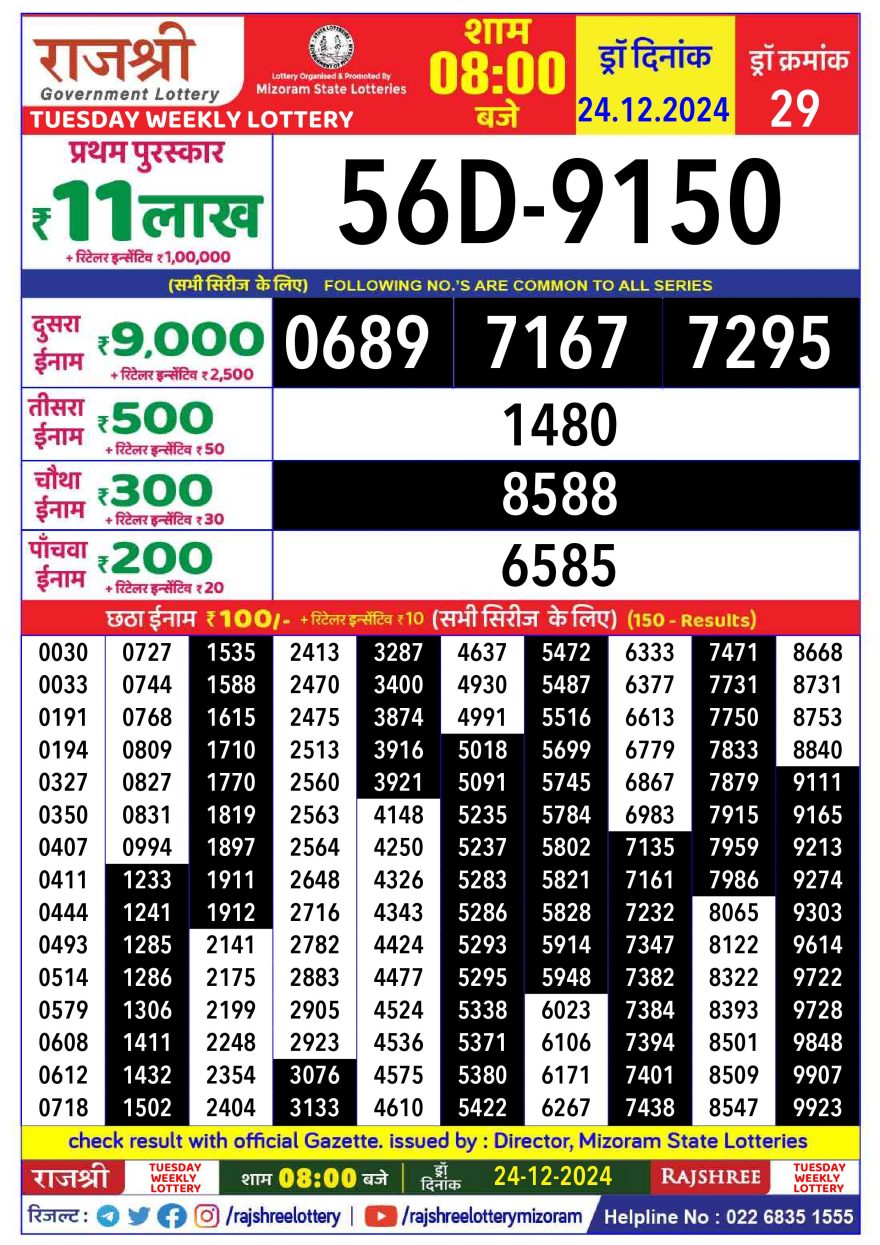 Rajshree  Weekly Lottery 8PM Result 24.12.24