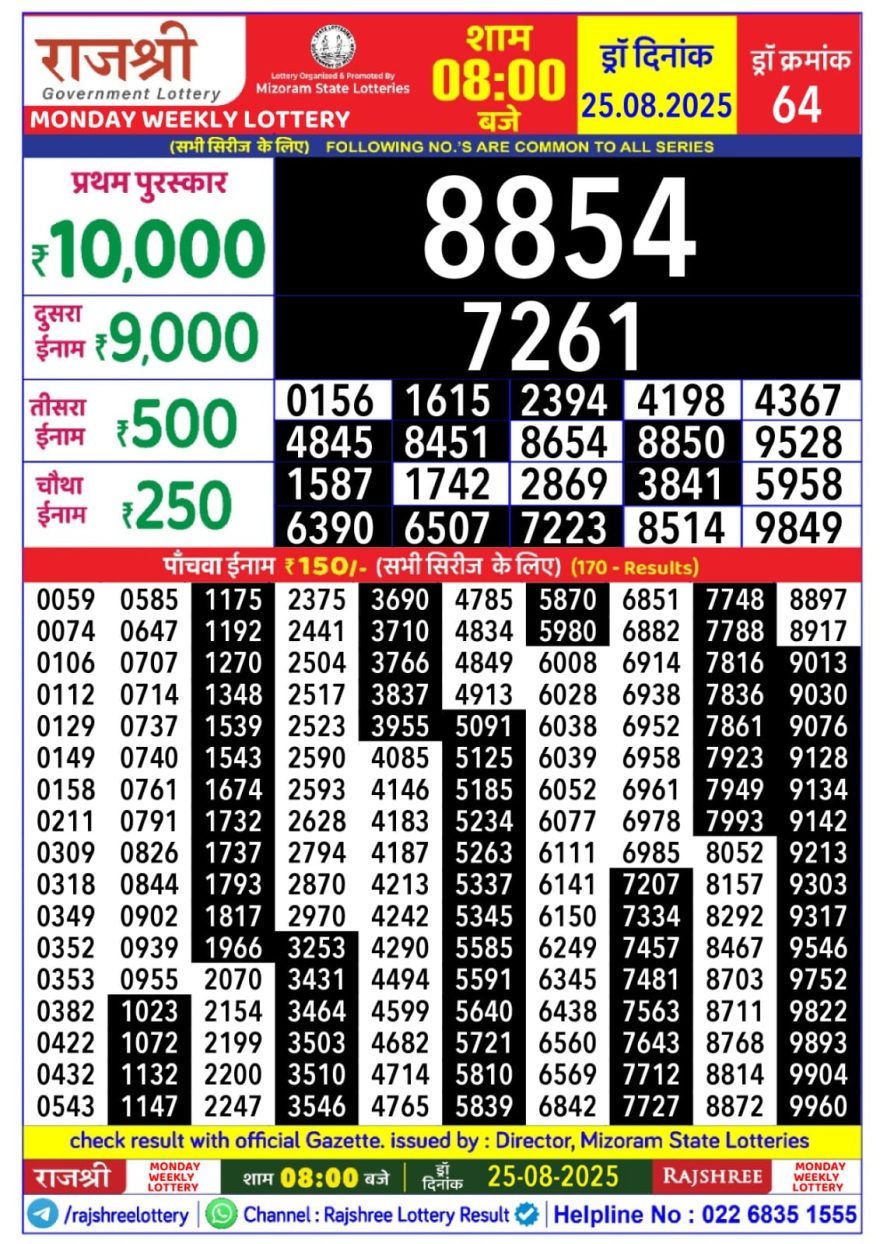 Rajshree Weekly Lottery 8pm Result 25.08.2025