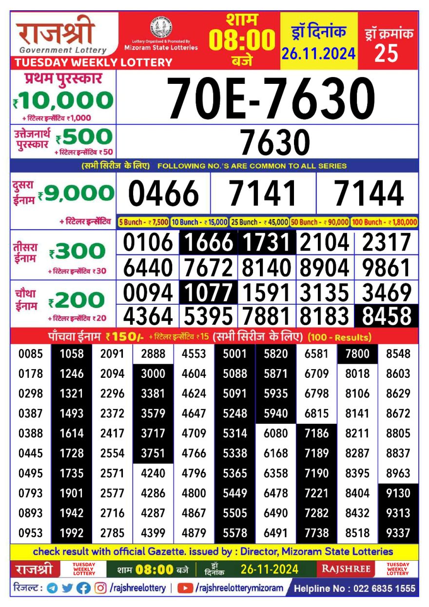 Rajshree  Weekly Lottery 8PM Result 26.11.24