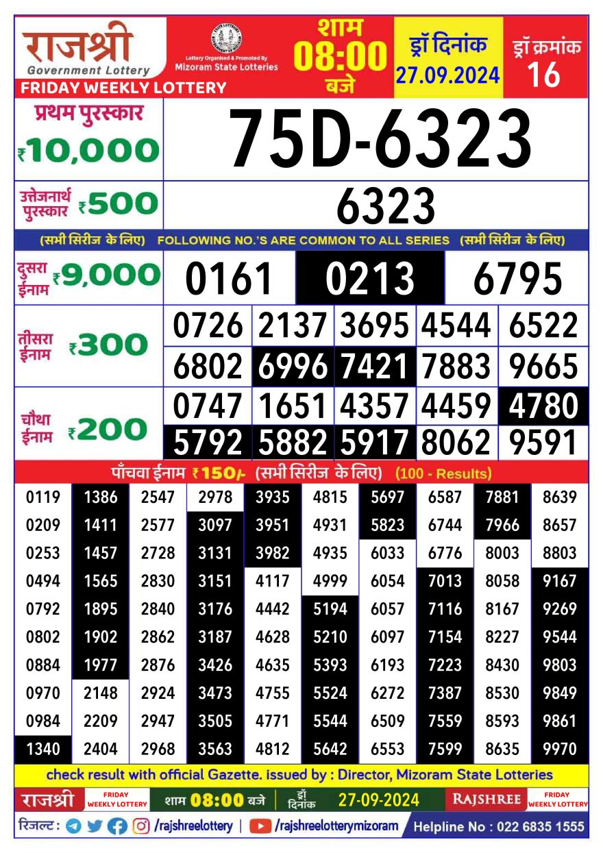 Rajshree  Weekly Lottery 8PM Result 27.09.24
