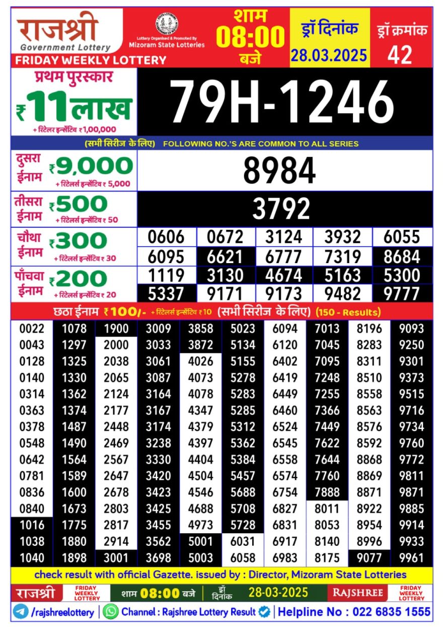 Rajshree Weekly Lottery 8PM Result 28.3.2025