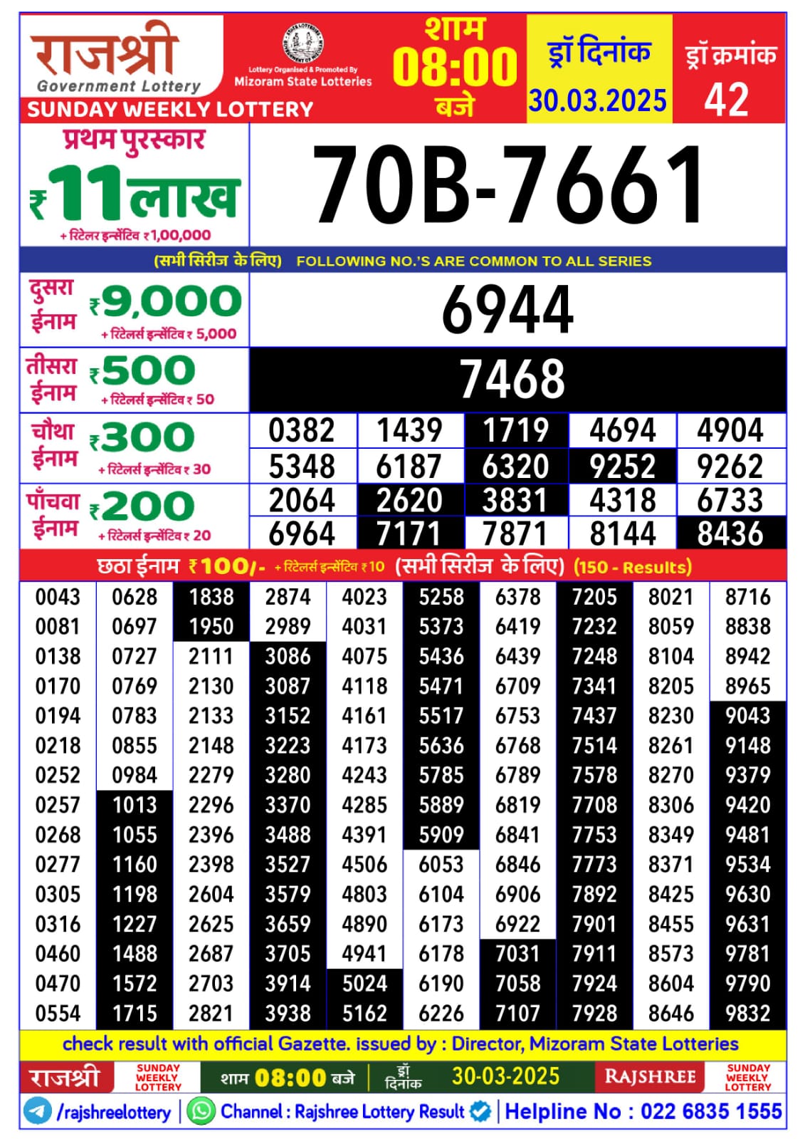 Rajshree Weekly Lottery 8PM Result 30.3.25