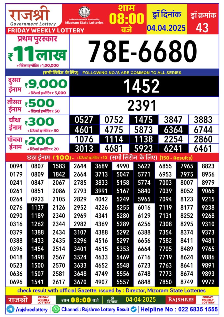 Rajshree Weekly Lottery 8PM Result 4.4.2025