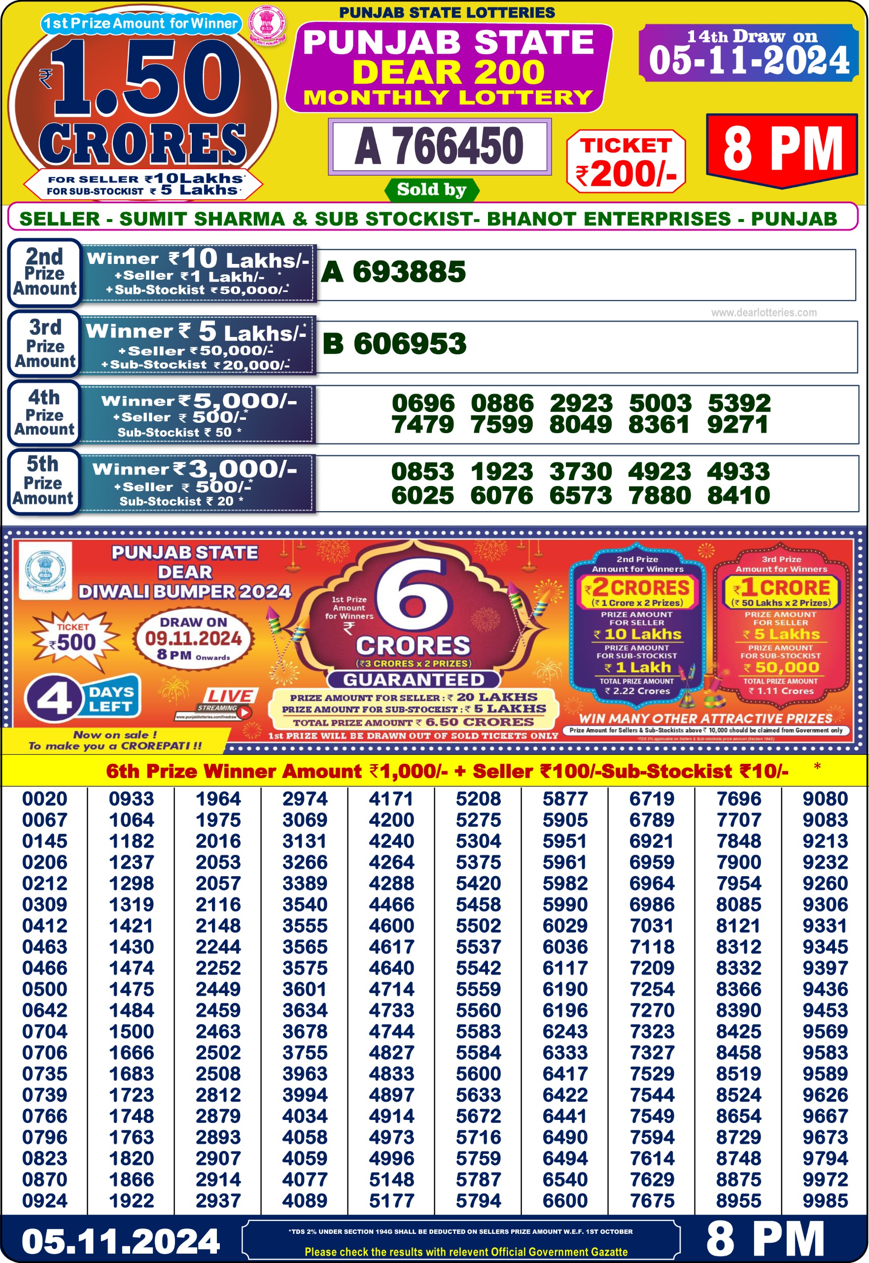 Punjab State Dear 200 Monthly Lottery Result 5 Nov 2024